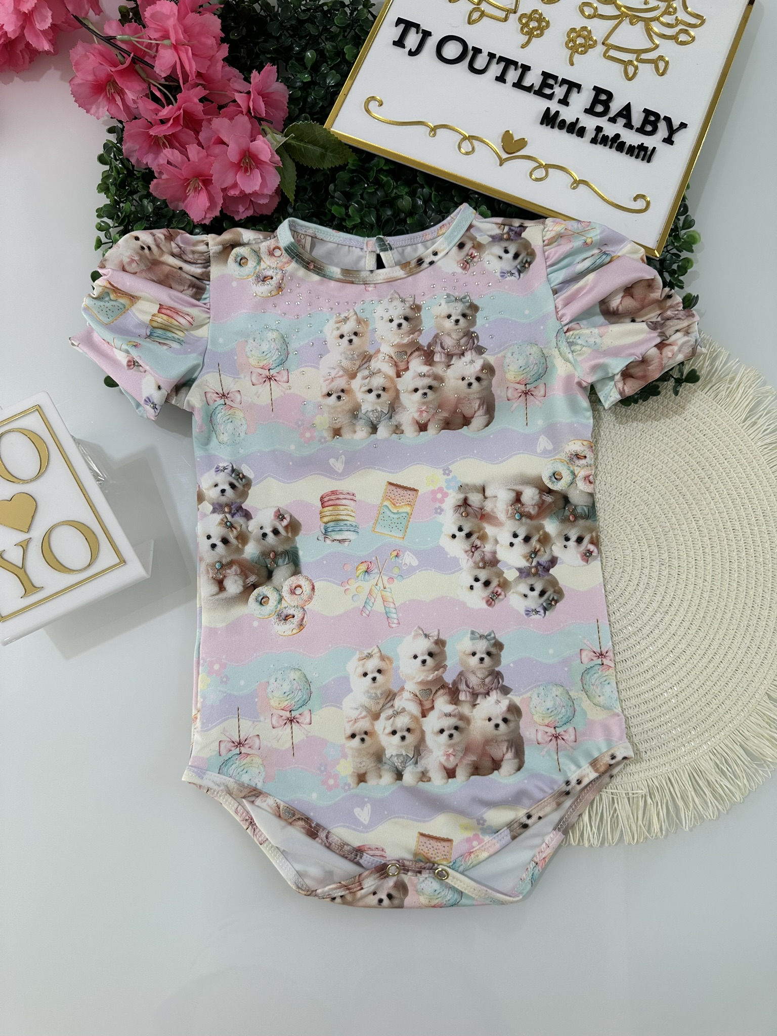 • Body, detalhes em pedrarias, estampa Cachorrinhos e doces, mangas Bufantes, tecido poliéster com elastano.