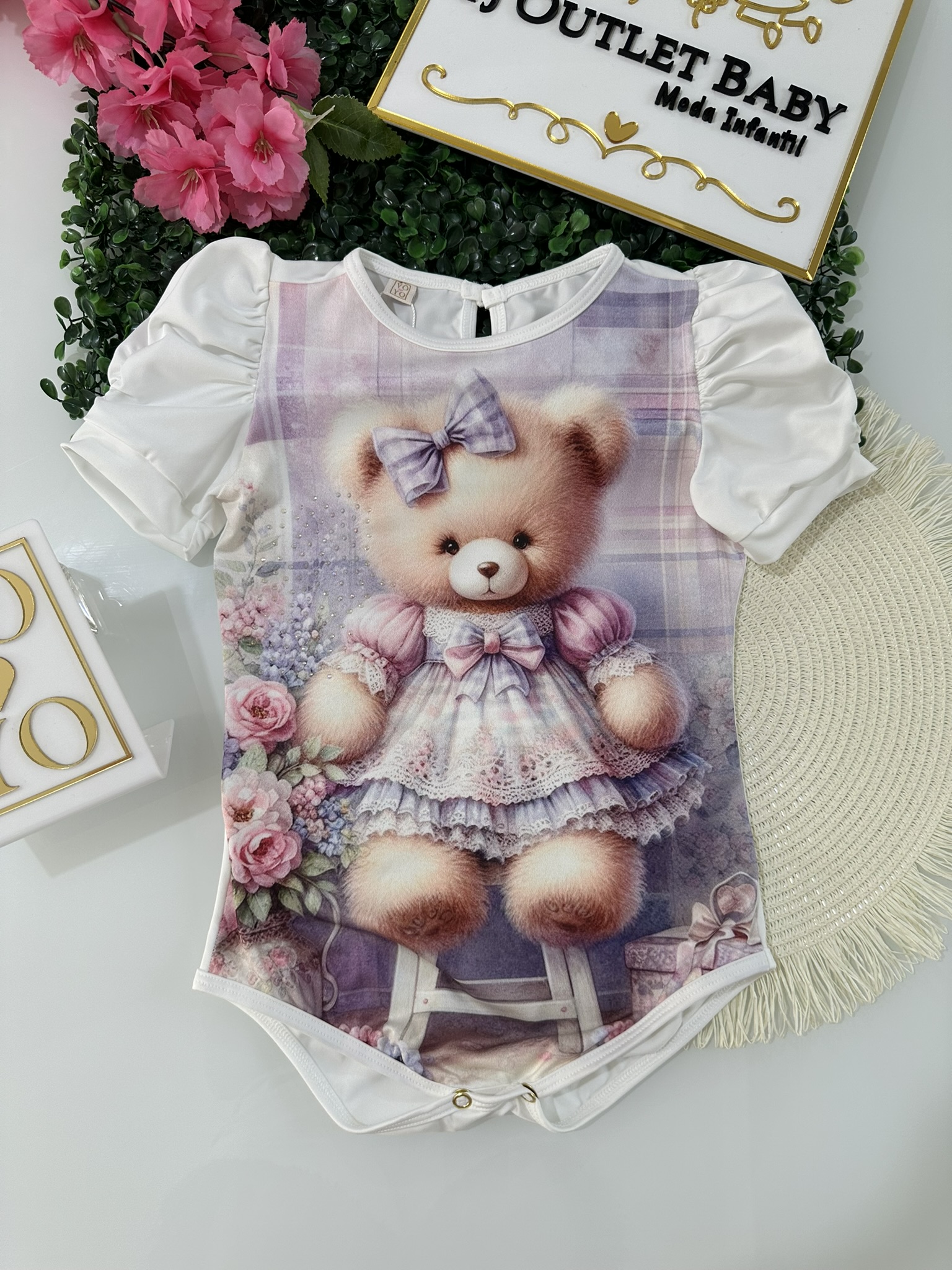 • Body, detalhes em pedrarias, estampa Urso, mangas Bufantes, tecido poliéster com elastano.