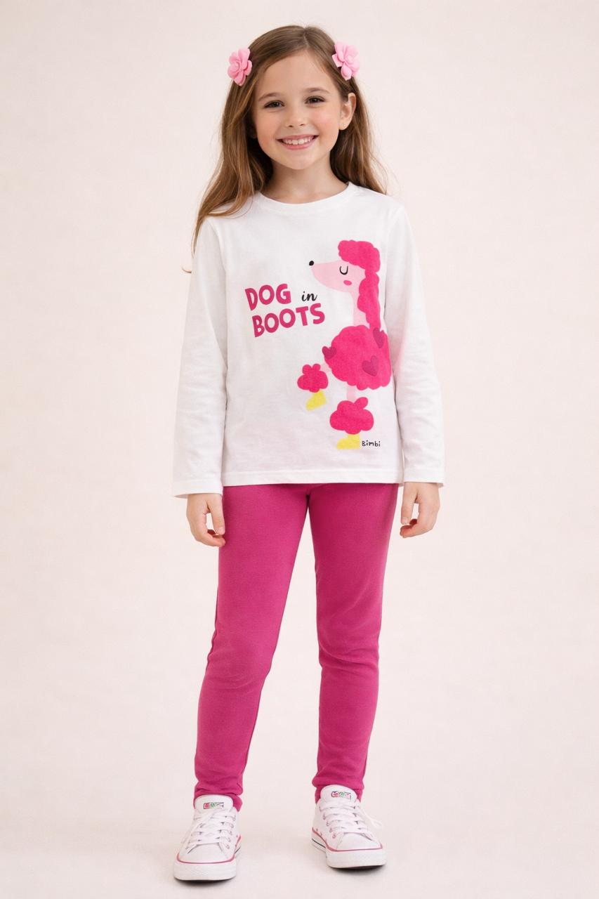 O conjunto é composto por uma blusa de manga longa em tom off-white com estampa de um cachorrinho rosa vibrante e frase "Dog in boots". A calça é em tecido de algodão na cor pink vibrante, com modelagem confortável para facilitar os movimentos dos pequenos