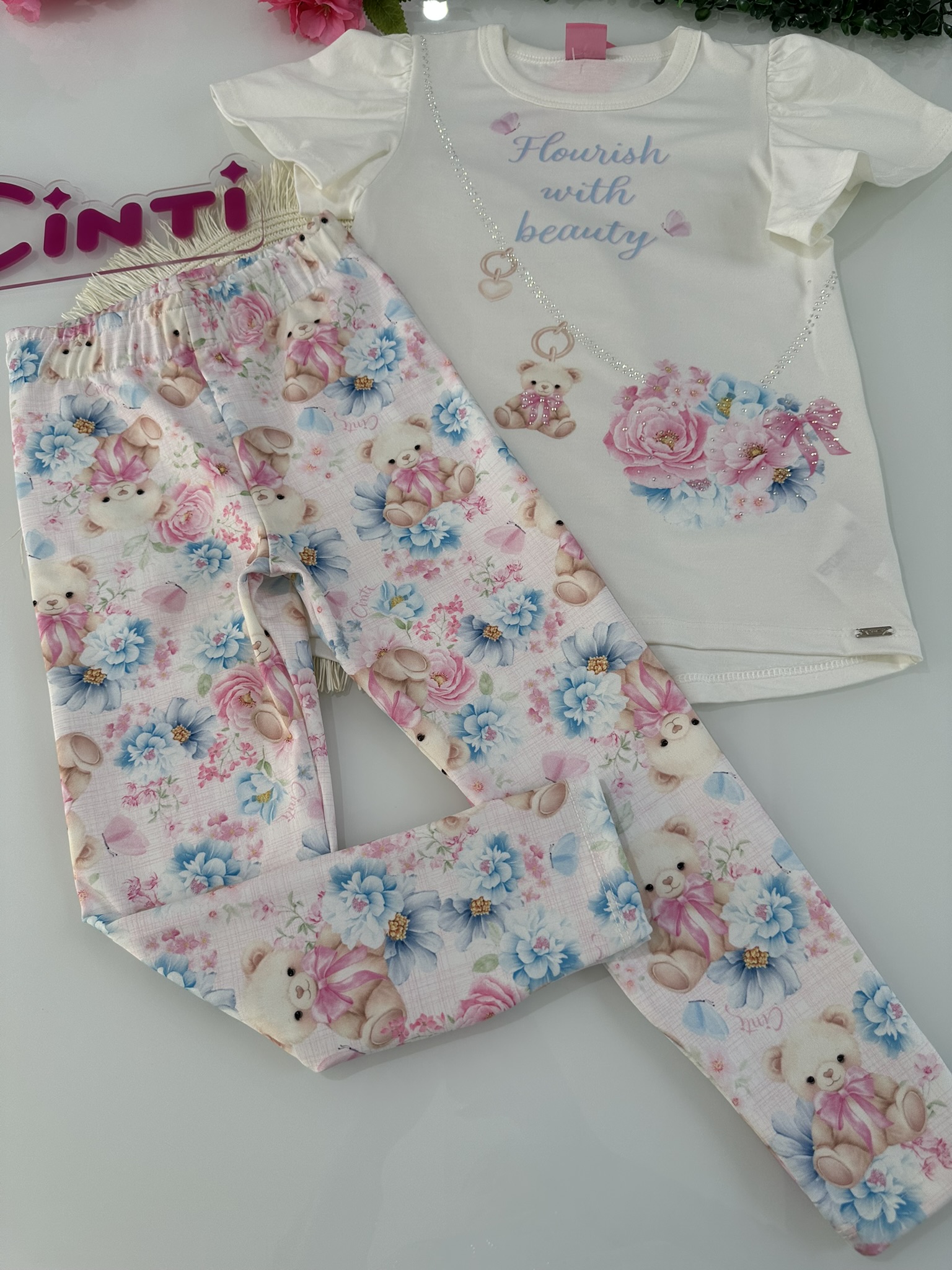 • Blusa detalhes na estampa em strass, mangas sino, tecido Algodão, poliéster e elastano, Calça Legging com elastico na cintura, poliéster com elastano.