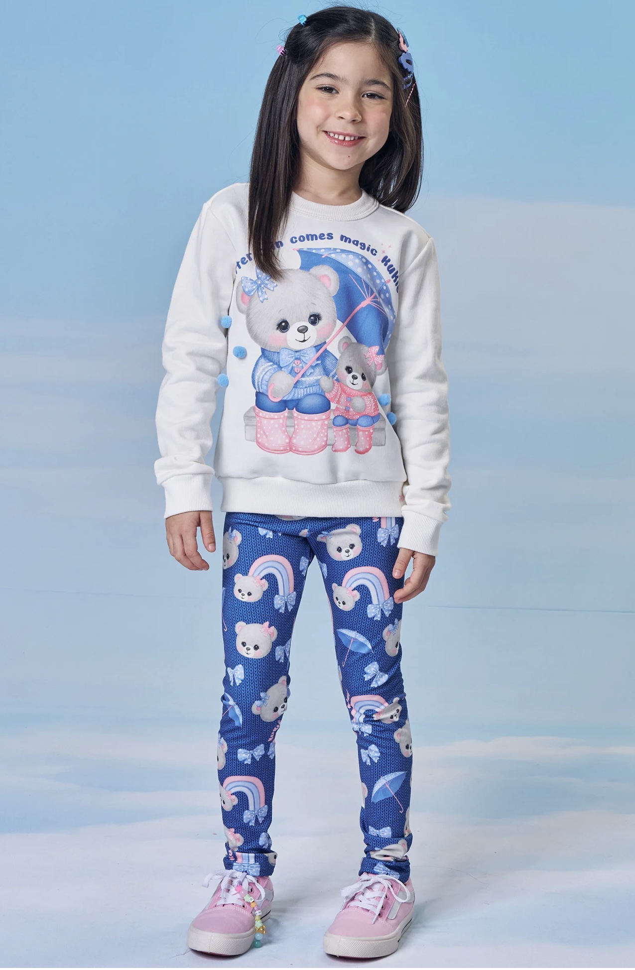 Conjunto infantil composto por blusa de moletom peluciado e calça legging térmica com estampa divertida e detalhes em strass.