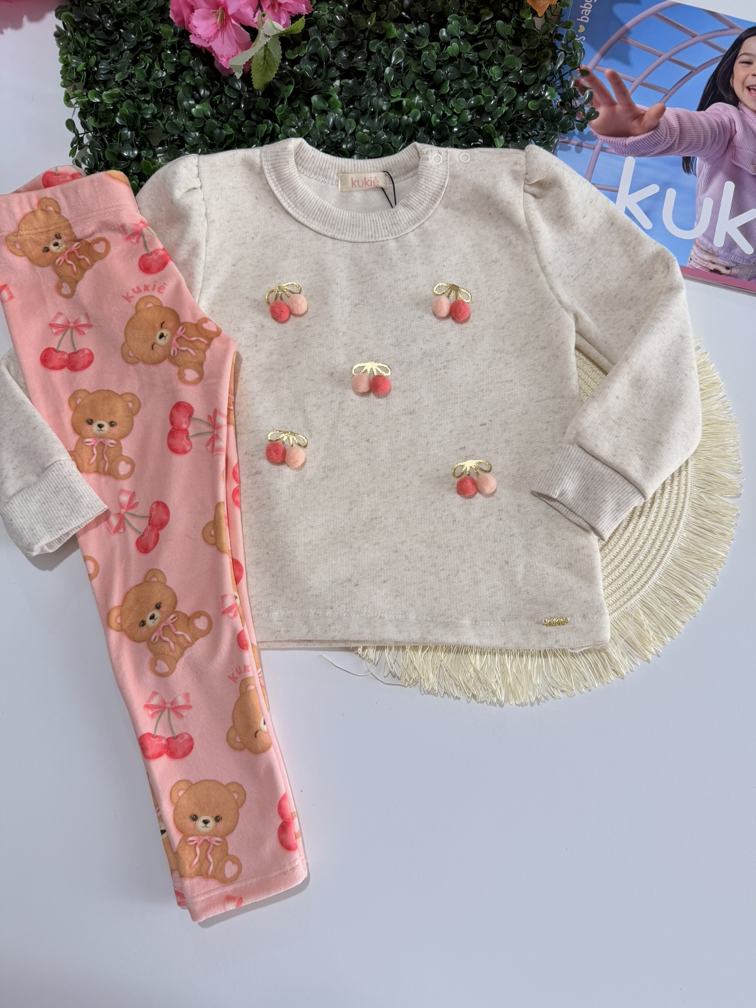 O conjunto é formado por blusa em moletom peluciado com acabamento em cerejinhas em relevo (3D) na parte frontal e calça em tecido fleece, que garante aquecimento e conforto. A cintura da calça tem elástico que ajusta sem apertar, facilitando o uso e movimentação do bebê. Peças com toque macio e seguras para a pele delicada do bebê.