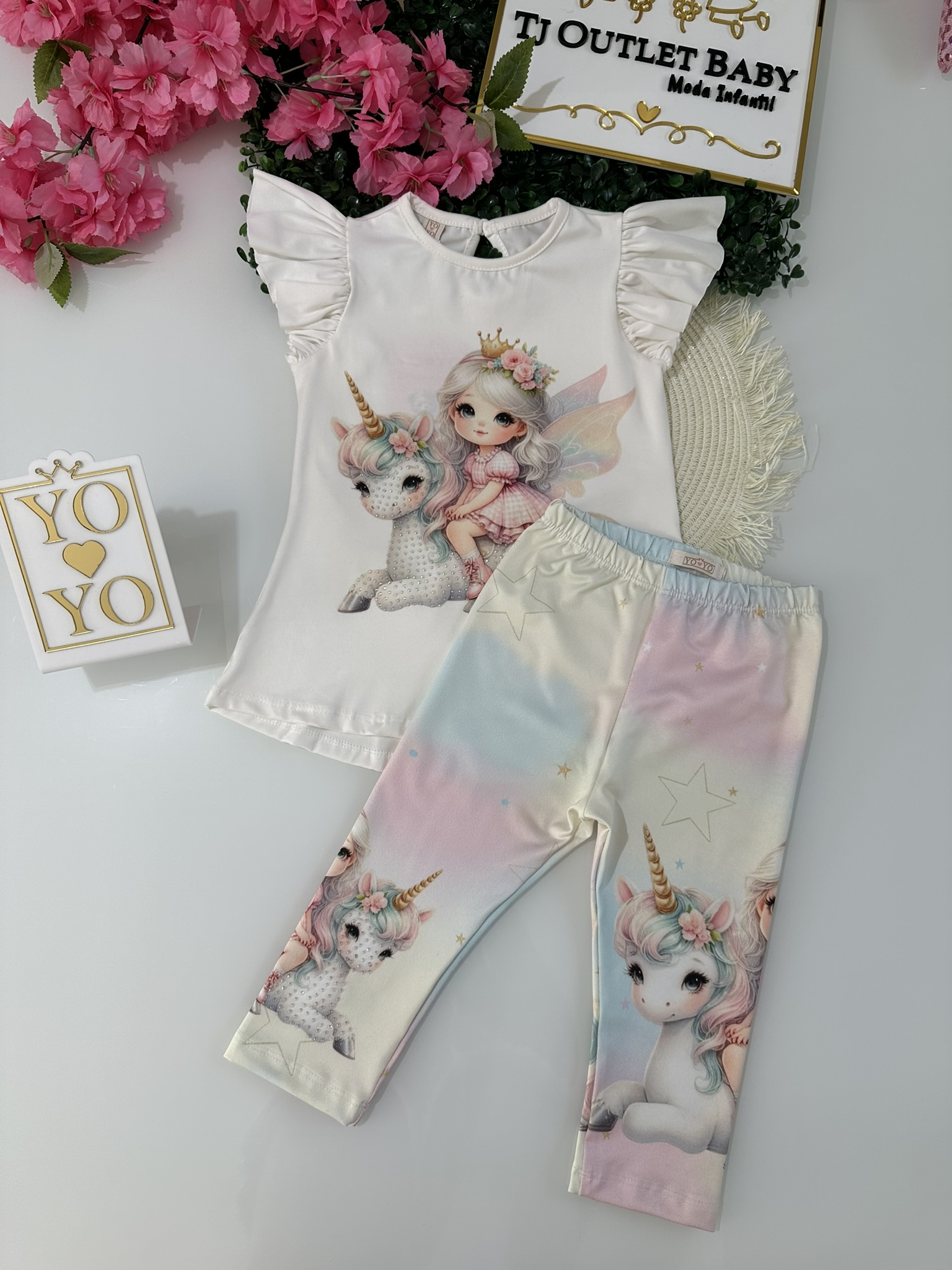 • Blusa Blusa, estampa uicórnio e fada, manga babados, tecido poliéster com elastano, calça capri detalhes em pedrariass, elastico na cintura, tecido poliéster com elastano.