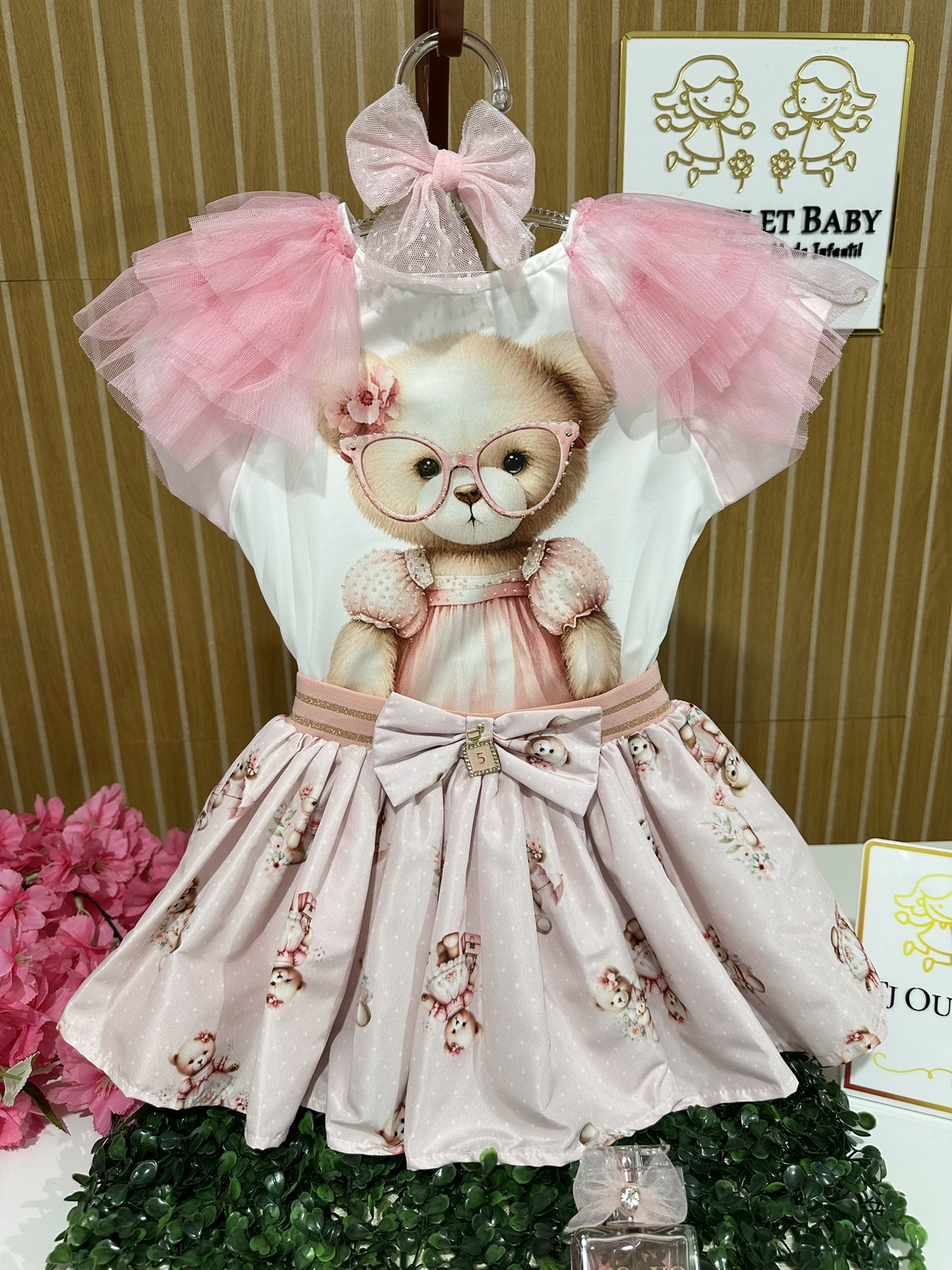 • Blusa , mangas com volume de tule, estampa ursa com detalhes em strass,tecido poliéster com elastano, saia modelo rodado, forro em shorts, tecido poliéster com elastano.