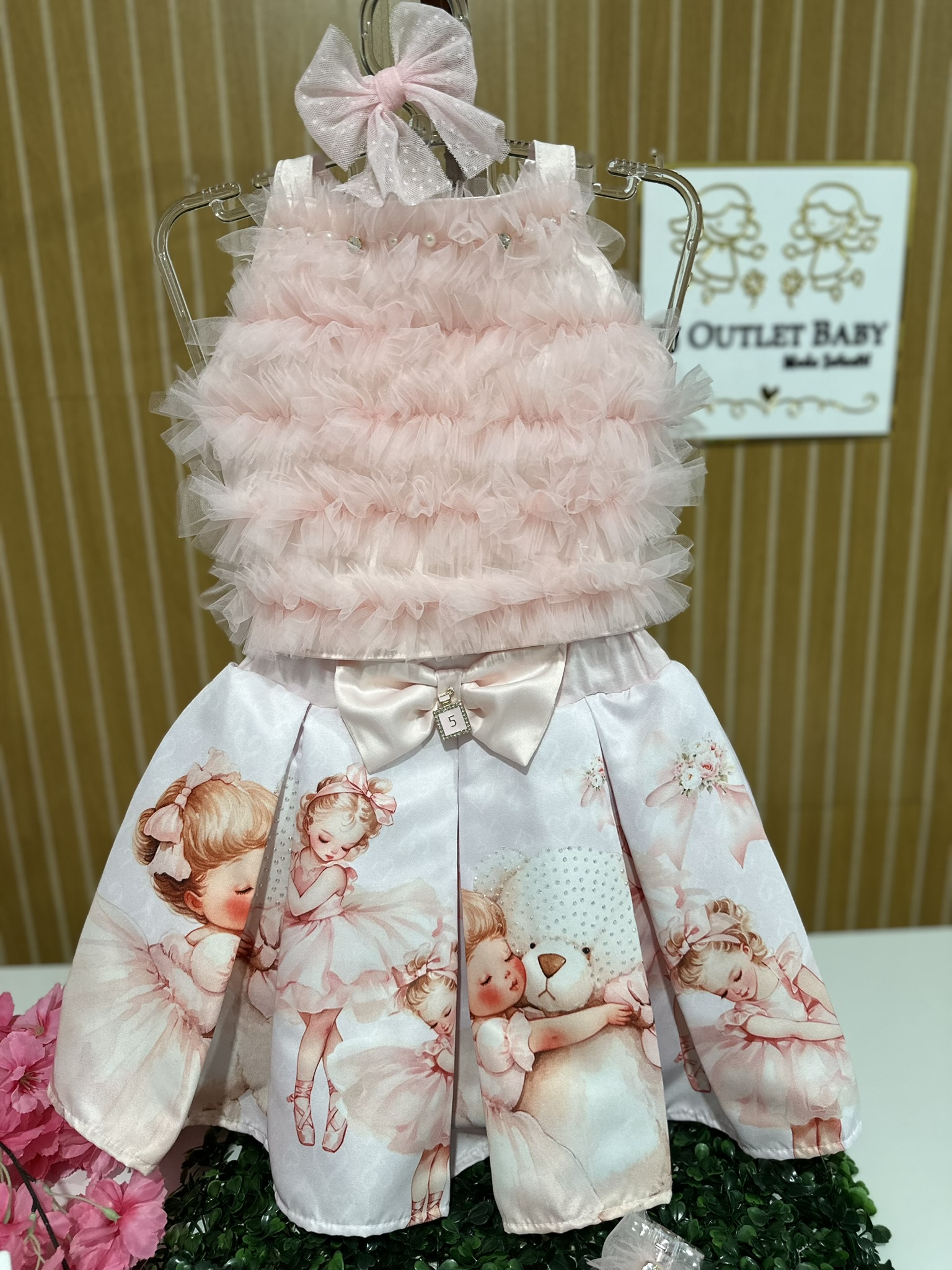• Blusa modelo em cima do cós, frente toda em fru-fru de tule, detalhes en perolas e pedrarias, costas com alças ajustáveis, tecido poliéster com elastano, saia modelo pregas rodado, com armação, forro em shorts, elastico na cintura, broche perfume com pedrarias, tecido poliéster com elastano.