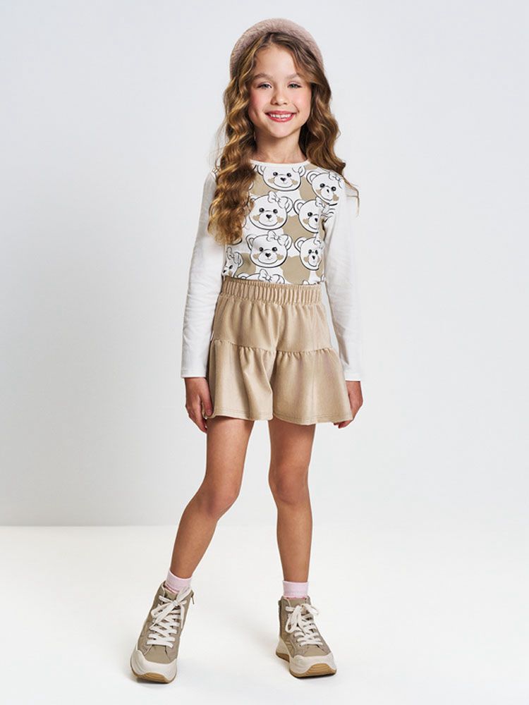 O Conjunto Blusa e Shorts Cinti traz uma blusa com estampa de ursos e detalhes em strass, combinada com shorts evasê em veludo suave para o conforto.