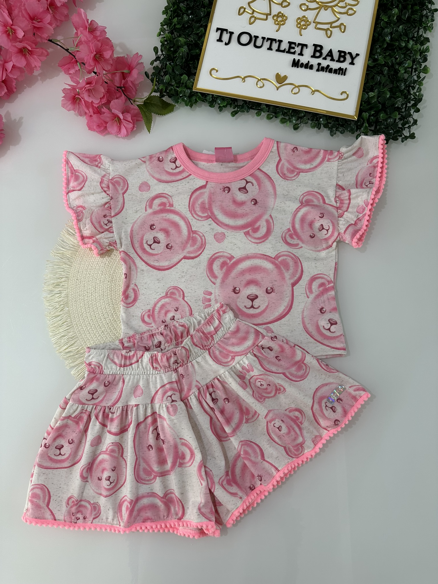 • Blusa  modelo beija cós, estampa Urso, mangas com detalhes, tecido Poliéster, linho e elastano, shorts modelo franzido, com elastico na cintura, poliéster, linho e poliéster.