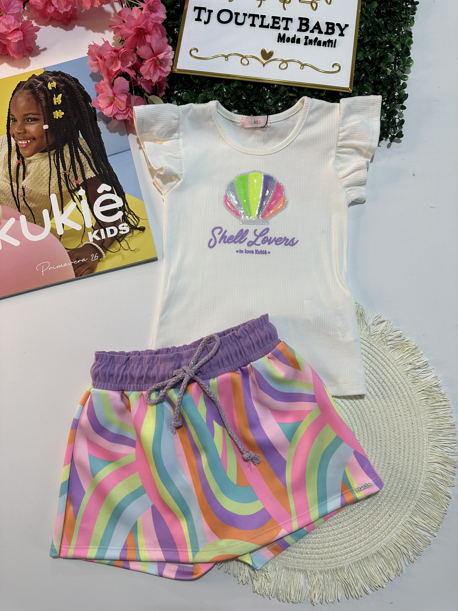 • Blusa com estampa concha com paetês, tecido algodão e elastano, shorts saia, elastico e ajuste na cintura, tecido poliéster.