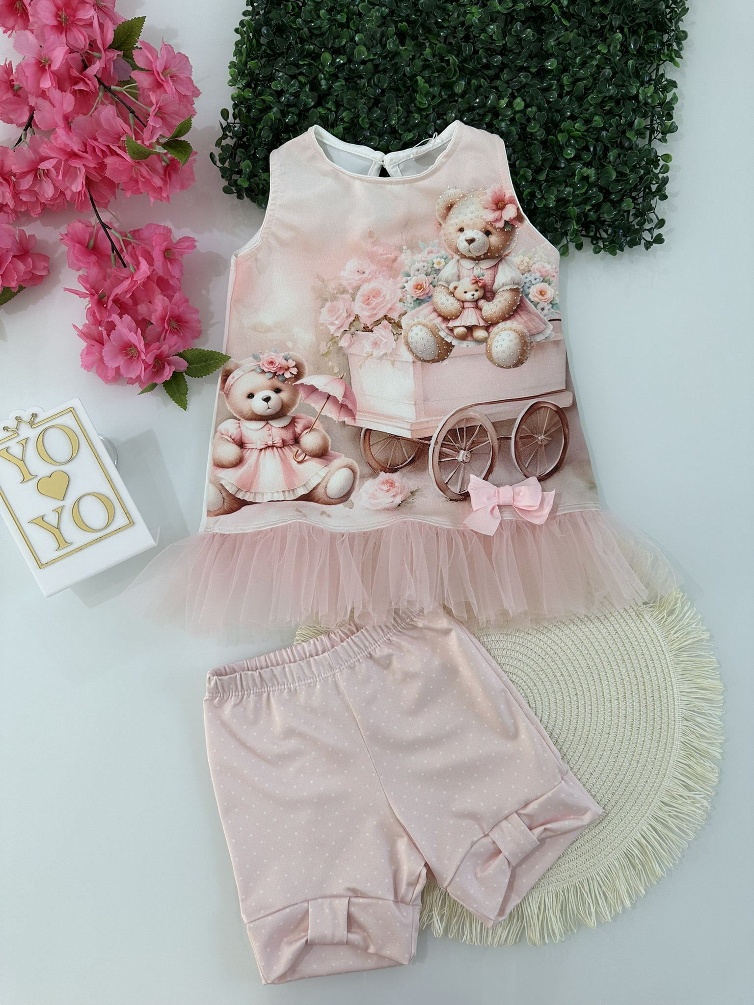 • Blusa regata, estampa ursas com detalhes em strass, barrado com tule e laço, tecido poliéster com elastano, Shorts com elastico na cintura, tecido poliéster com elastano.