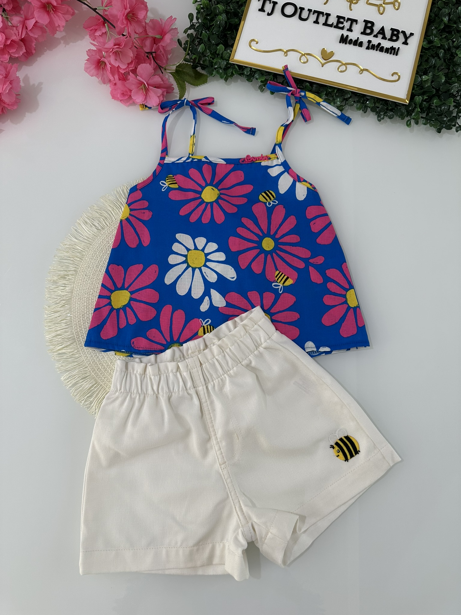 • Regata alças ajustavéis, tecido algodão, shorts em sarja, bordado abelhinha, com elastico na cintura, Algodão.