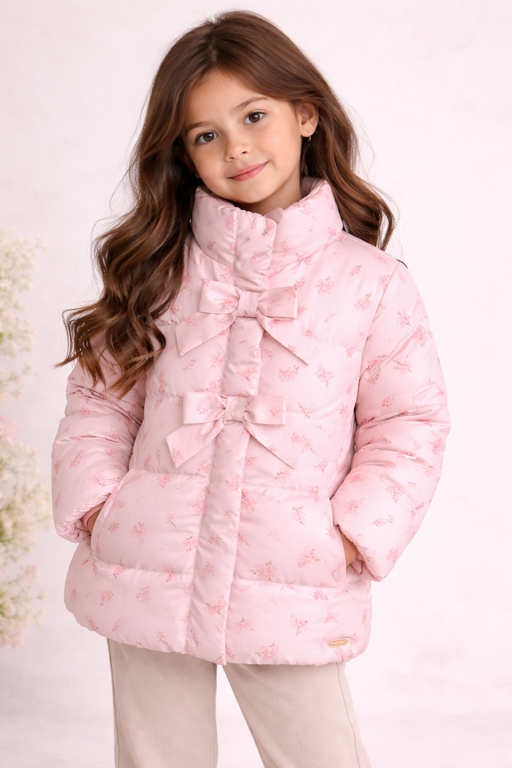 A jaqueta é confeccionada em tecido acolchoado no estilo puffer, com estampas florais sutis em rosa claro. Possui fechamento frontal por zíper e botões para aumentar a proteção contra o frio. O interior é completamente forrado com pelúcia, garantindo toque macio e bem quente para os dias mais frios. Modelagem adequada para crianças, com bolsos laterais para maior praticidade.
