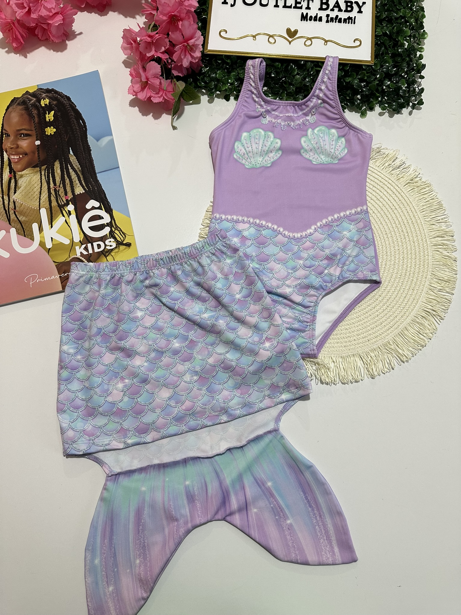 • Maiô Estampa sereia, detalhes em strass, com proteção UV, saiada cauda com elástico na cintura, tecido poliéster com elastano.