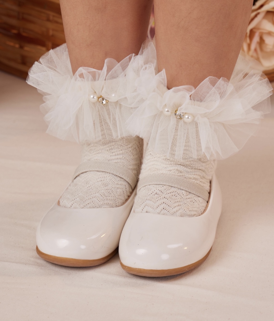 • MeiA com detalhe frufru de tule, com perolas e pedrarias.