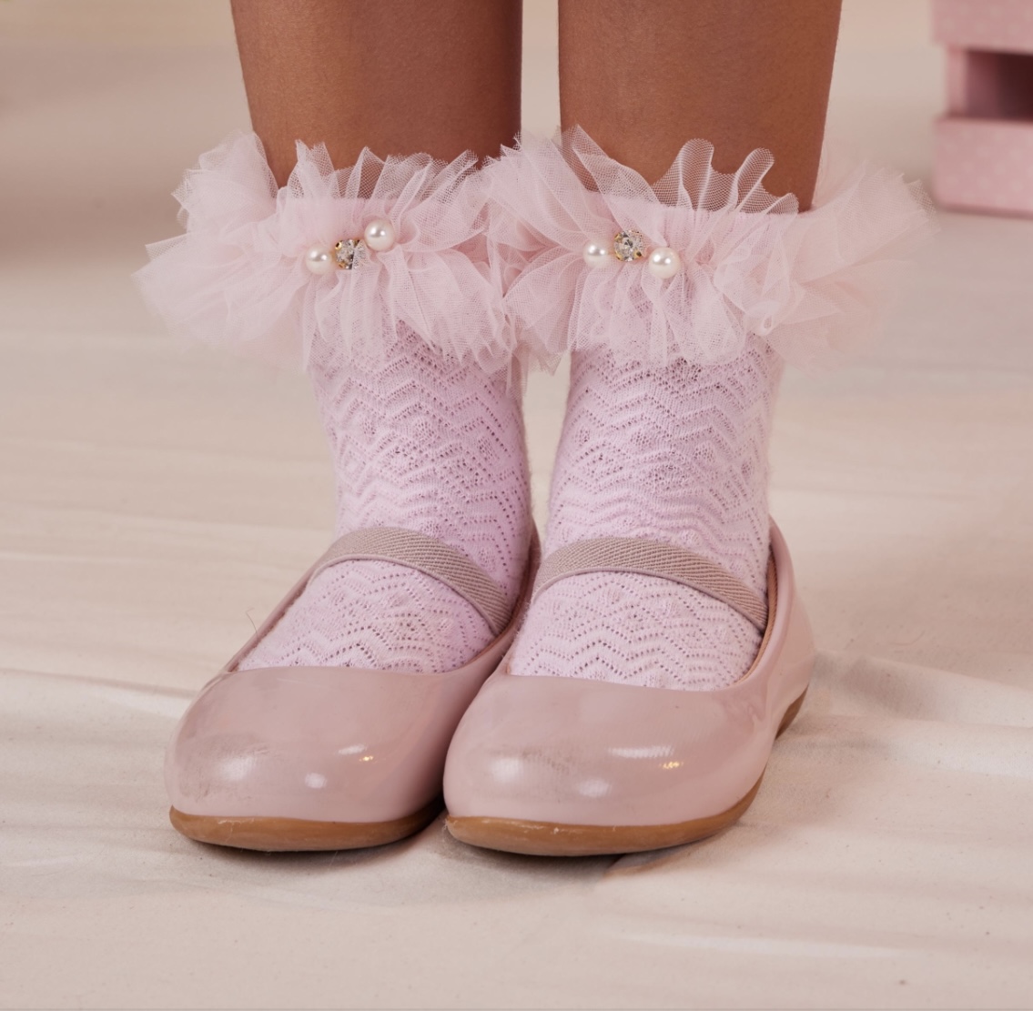 • MeiA com detalhe frufru de tule, com perolas e pedrarias.