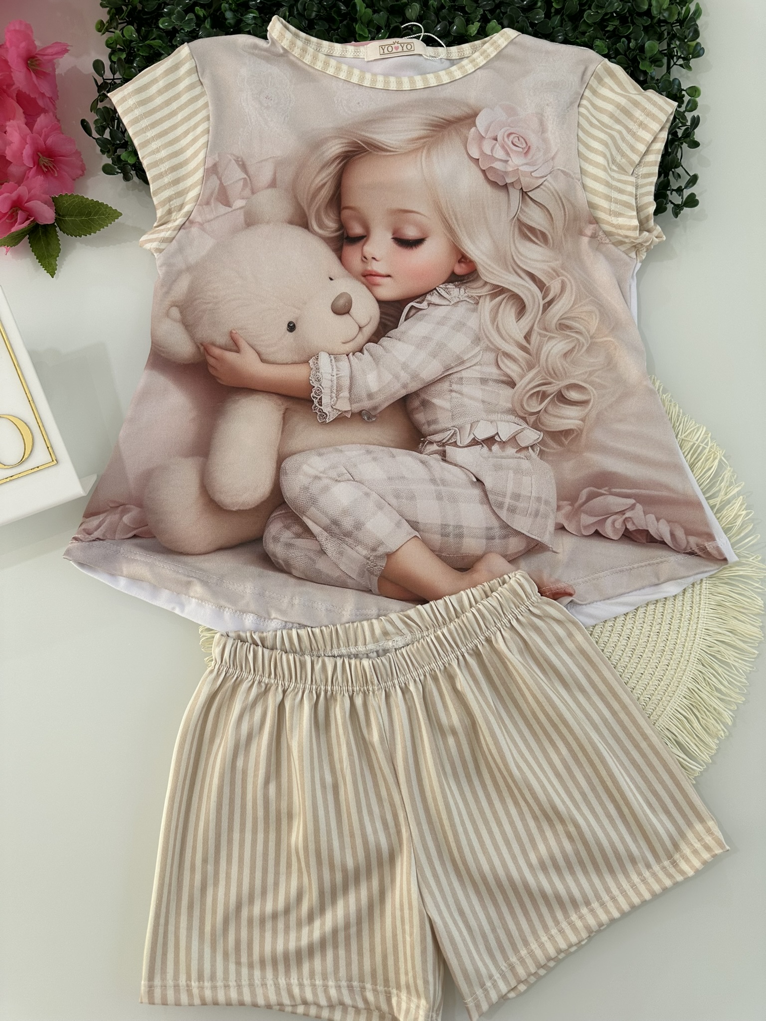 • Estapa menina com ursinho, modelo bem soltinho, tecido com toque macio, shorts com elastico na cintura, poliéster e elastano.