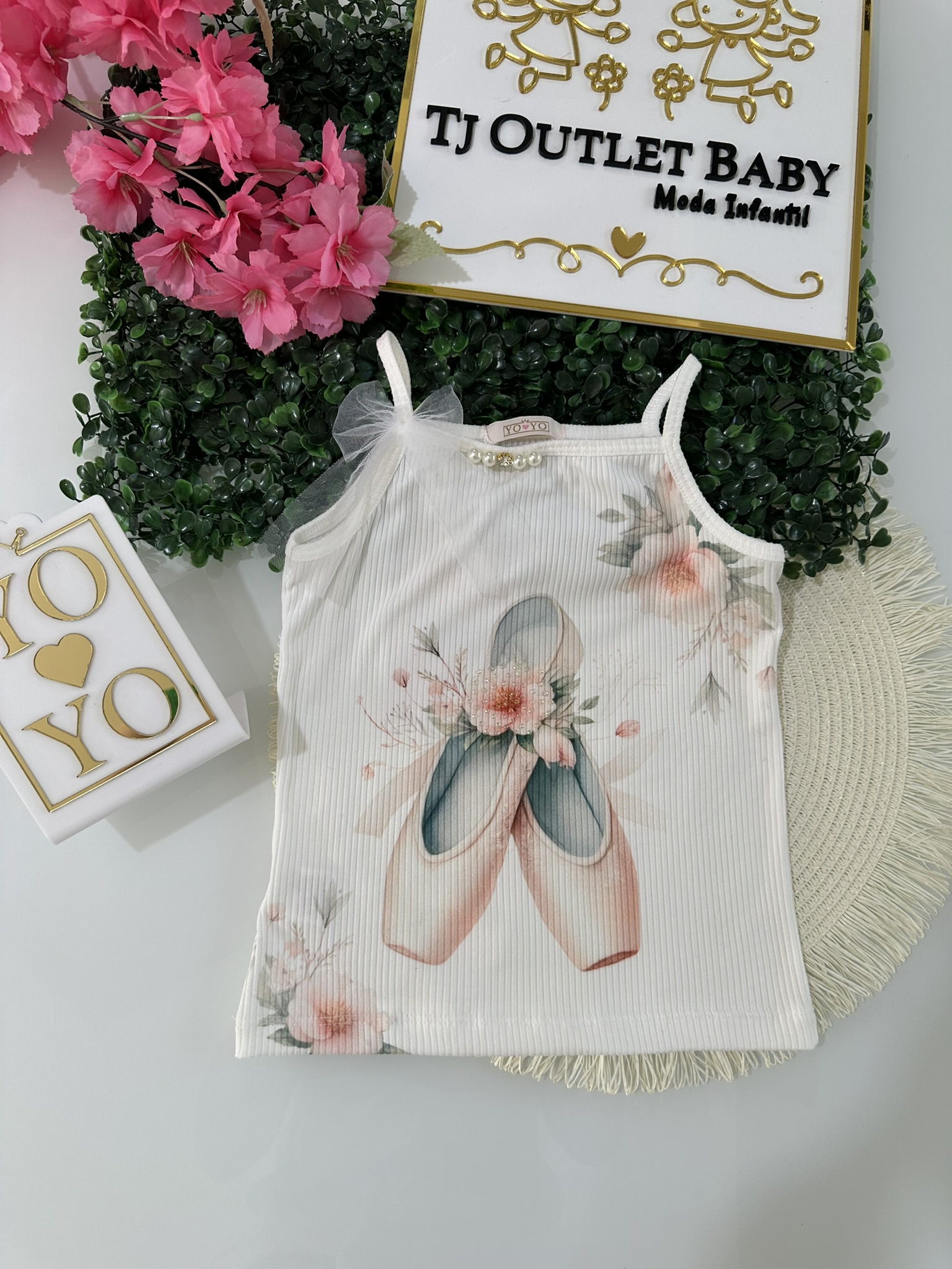 • Regata canelada, tecido macio e fresco, detalhes em laço tule, perolas e pedrarias, estampa Sapatilha , tecido poliéster com elastano.