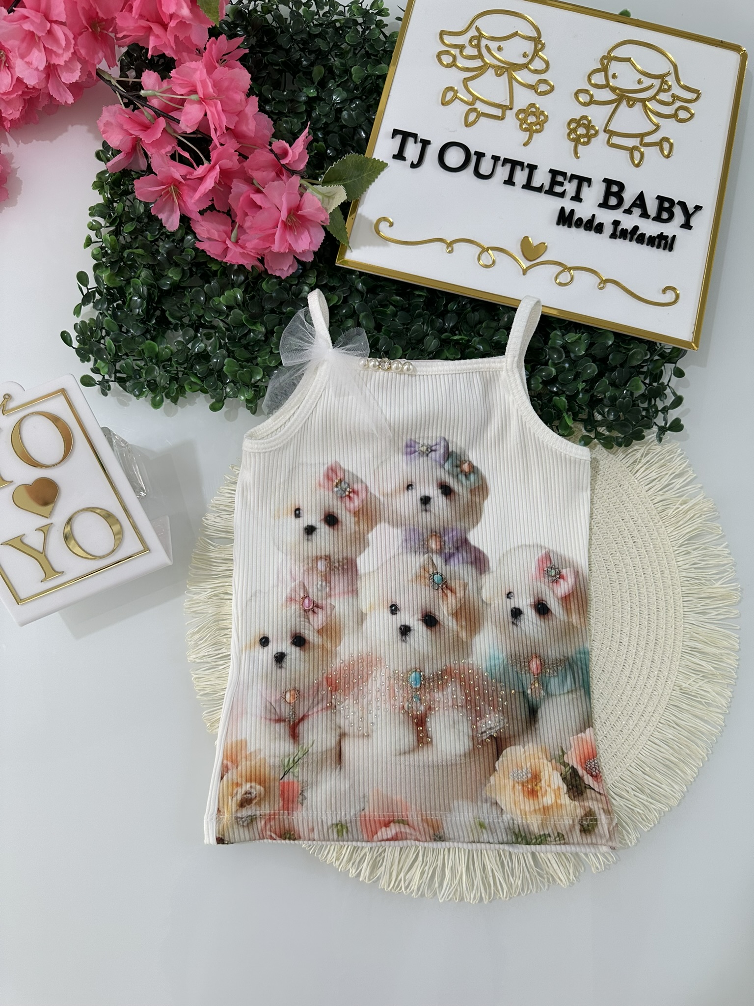 • Regata canelada, tecido macio e fresco, detalhes em laço tule, perolas e pedrarias, estampa cachorrinhos, tecido poliéster com elastano.