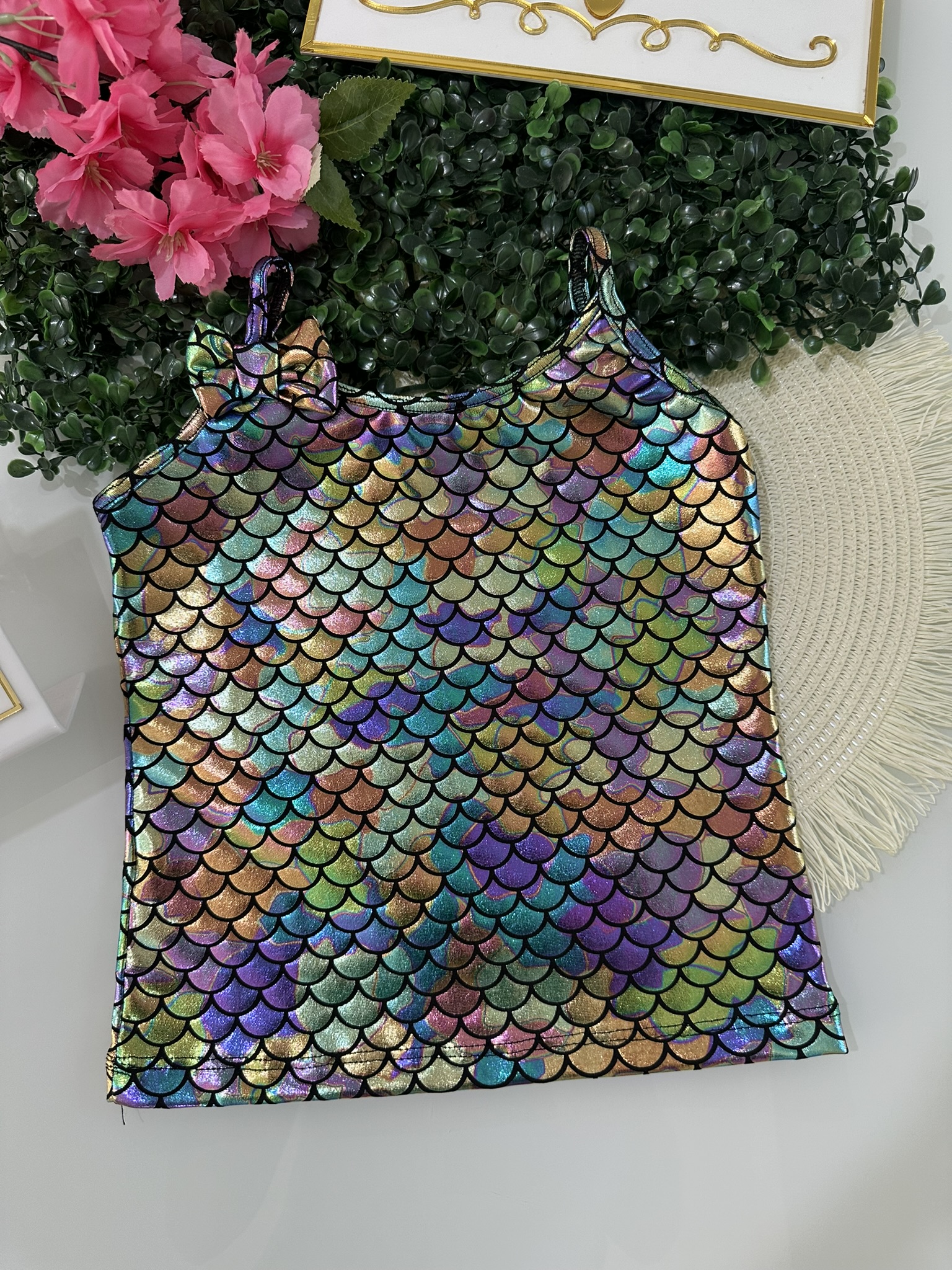 • Regata, detalhes em laço, estampa holográfica escamas, tecido poliéster com elastano.