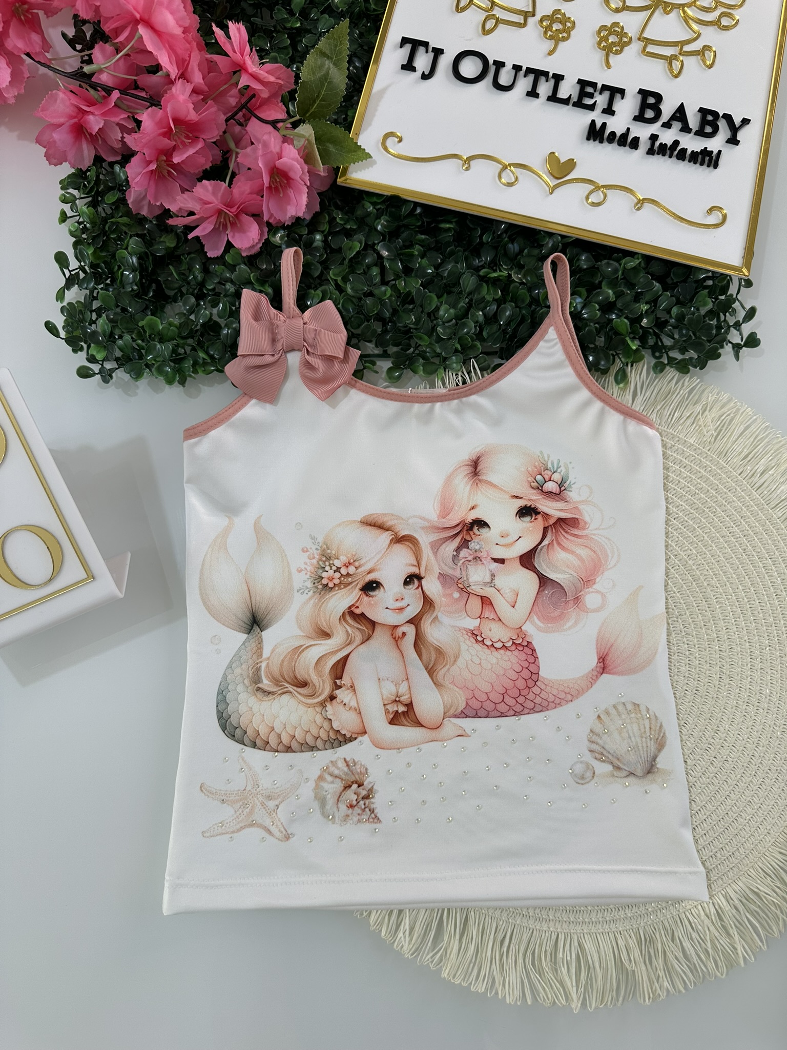 • Regata, detalhes em laço e strass, estampa Sereia, tecido poliéster com elastano.