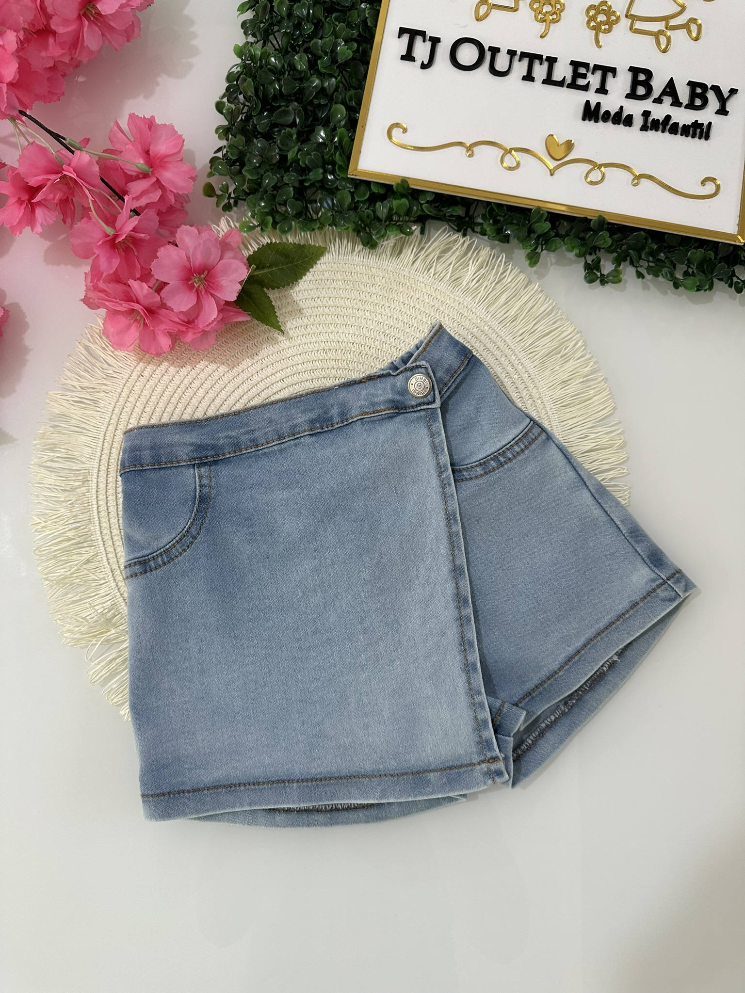 2.  Shorts saia Jeans com bastante elastano, modelo transpassado, com elastico na cintura, tecido Algodão, poliéster com elastano.