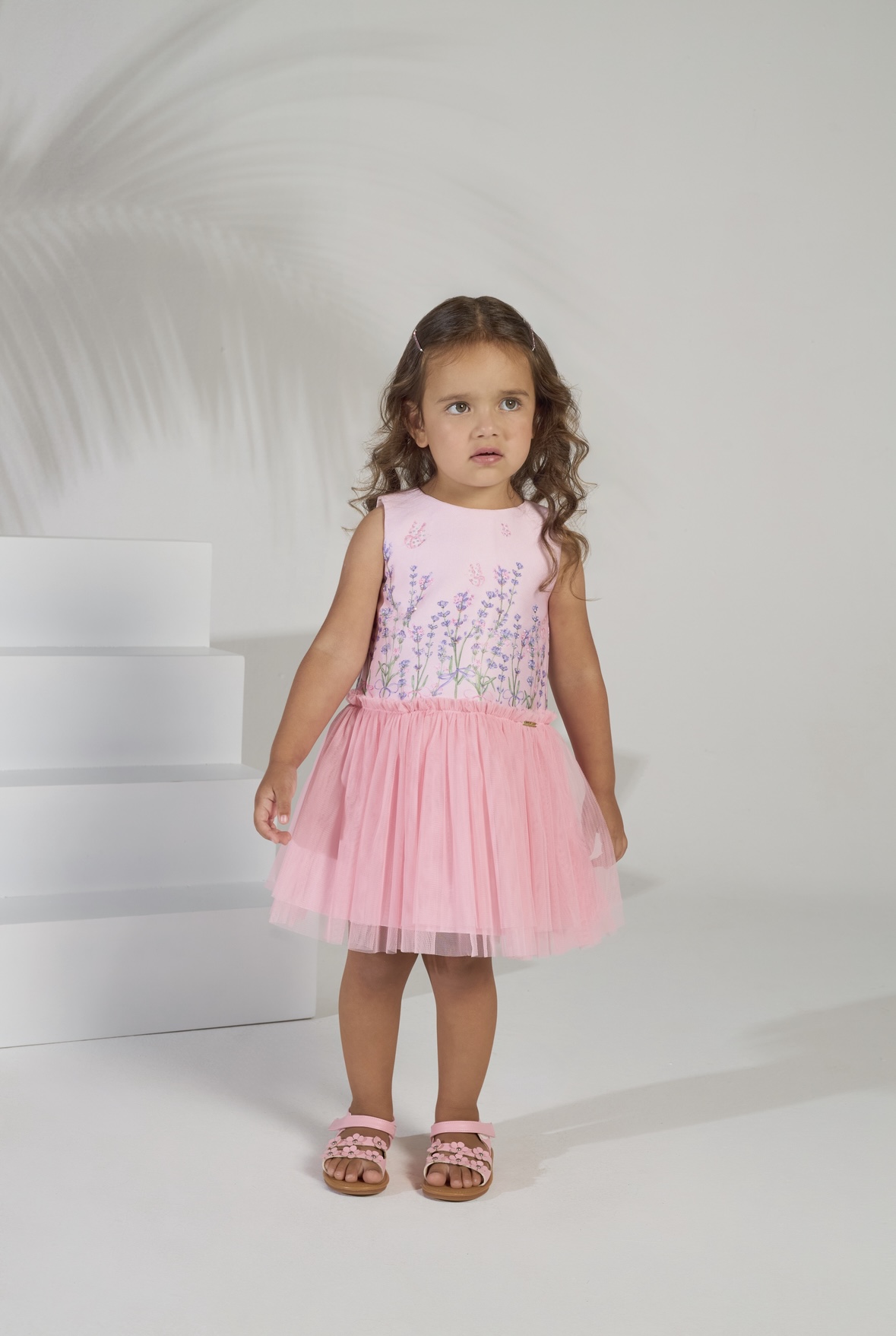• Vestido parte superior em tecido acetinado, estampa lavandas, detalhes em cristais, parte inferior sobreposta em tule, ziper nas costas, tecido poliéster.