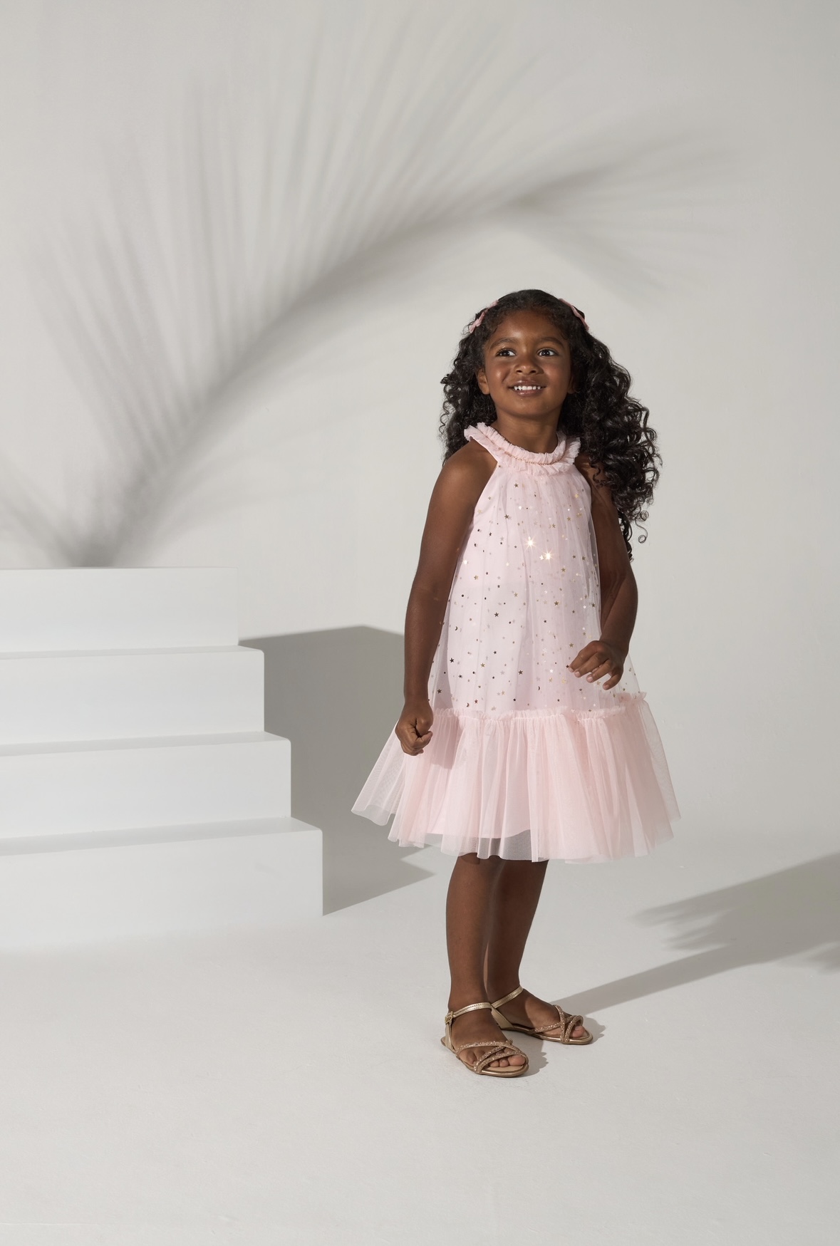 • Vestido sobreposto em tule com estampa de estrelas e lua holográfica, detalhe na gola com strass, tecido poliéster.