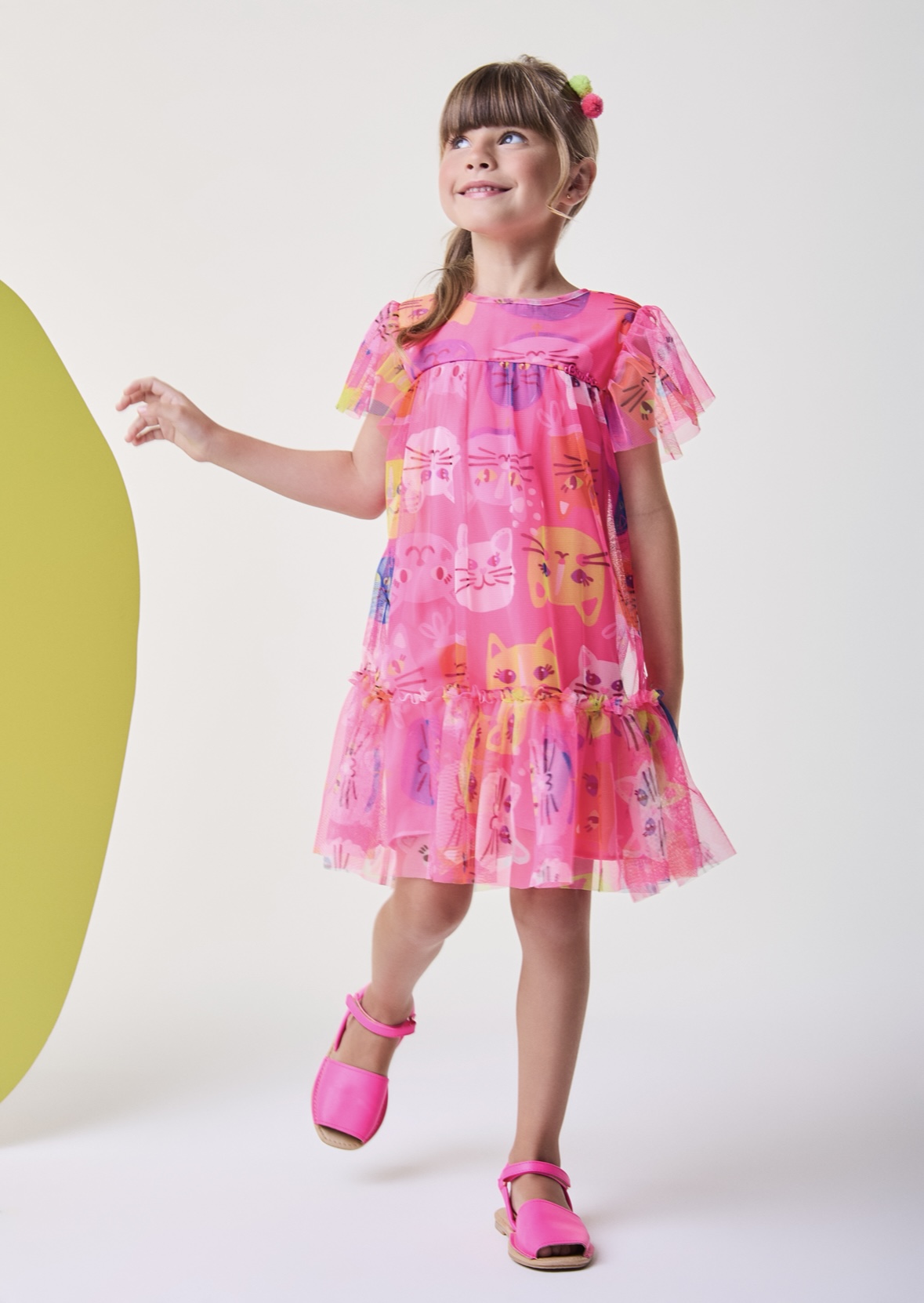 • Vestido sobreposto em tule com estampa gatinho, mangas delicadas e tule, forro, tecido poliéster e elastano.