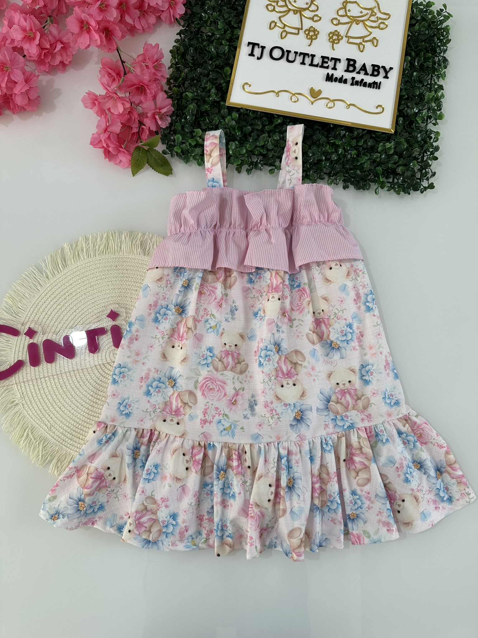 • Vestido Estampa Urso e floral, detalhes em babado, tecido algodão, poliéster com elastano.