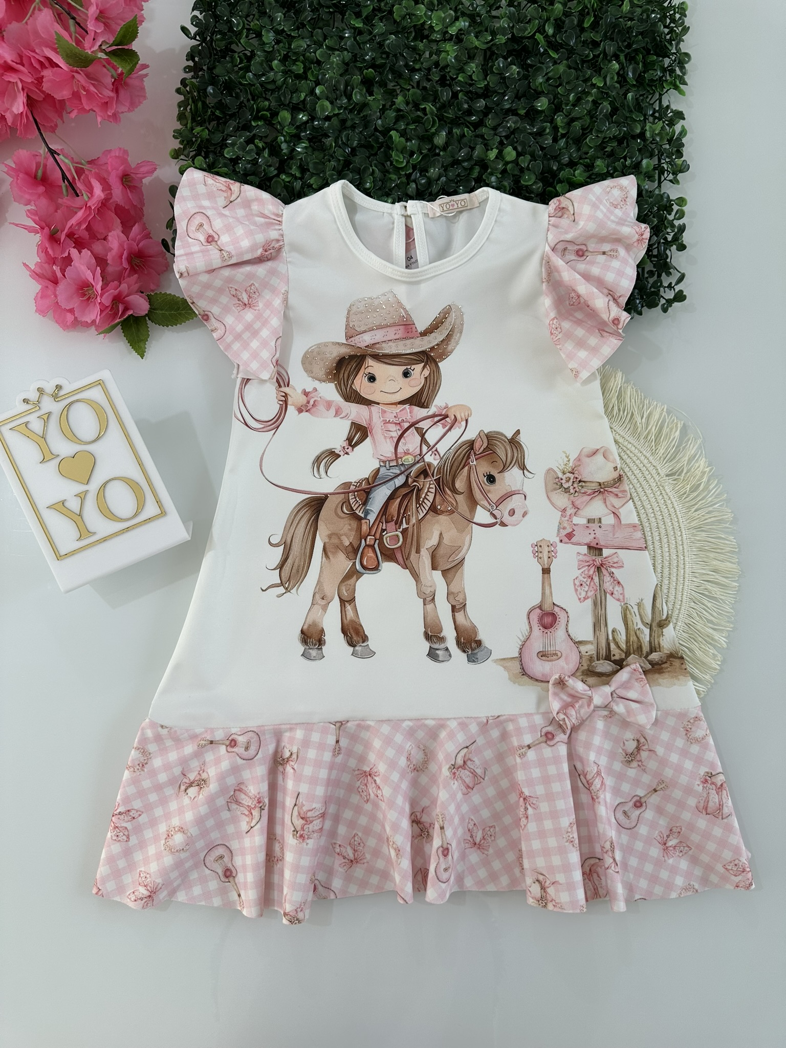 • Vestido estampa Boiadeira, detalhes em pedrarias, mangas e barrado em babados, detalhe em laço, tecido poliéster com elastano.