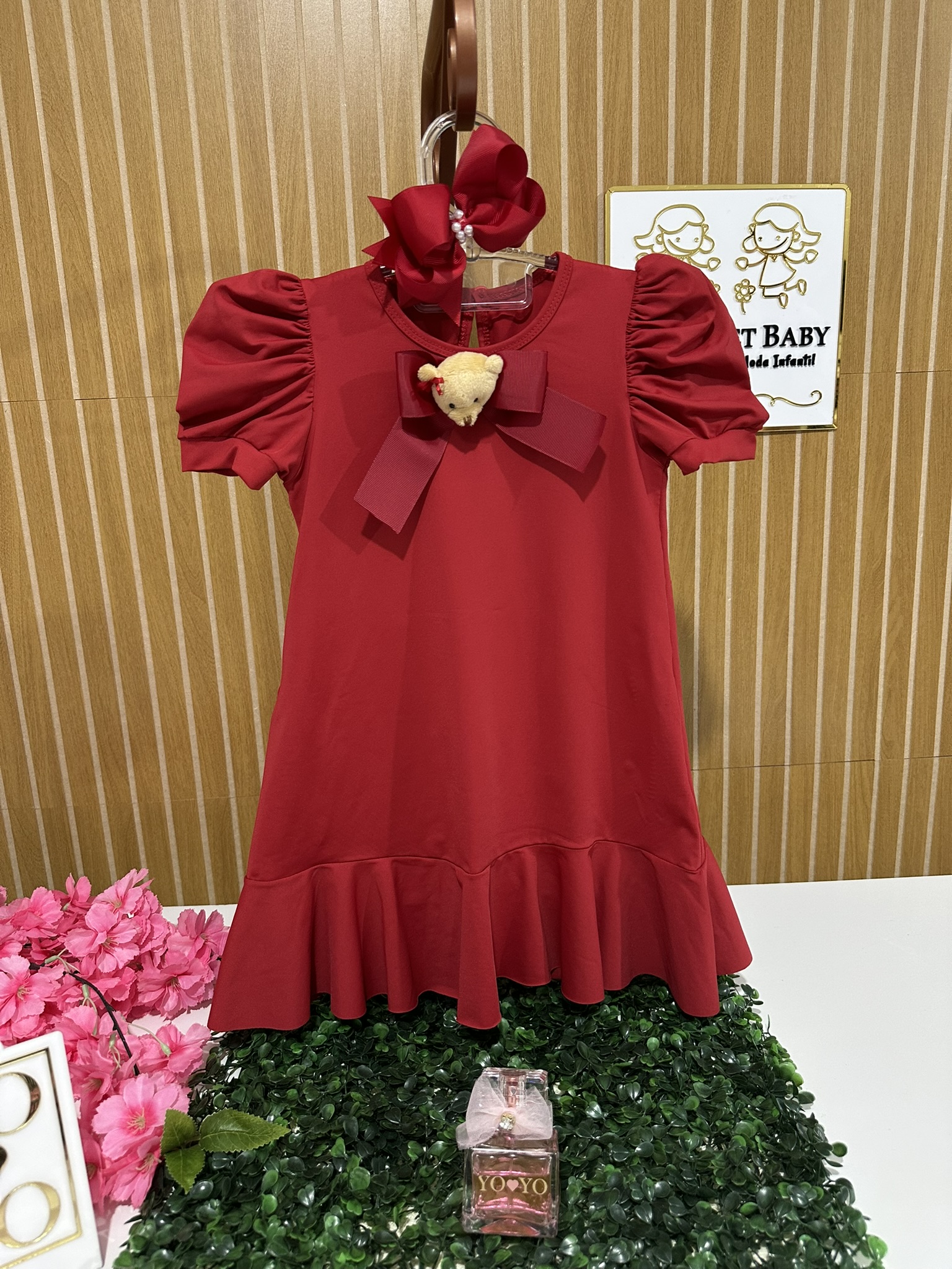 • Vestido vermelho, detalhe de laço com urso, urso com velcro, pode ser removido, mangas princesa fufantes, barrado em babados, tecido poliéster com elastano.